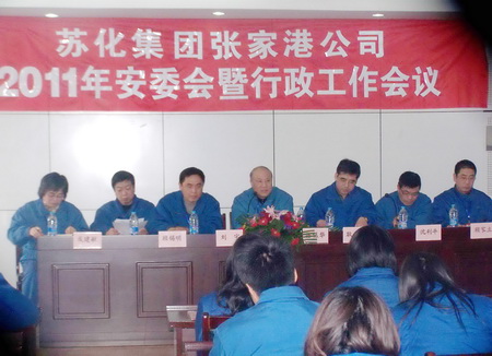 ????????2月18日,張家港公司公司召開2011年安委會暨行政工作會議。集團董事長楊振華到會作重要指示,公司總經理劉宇、副總經理成建敏分別講話,化工一廠廠長朱利康和化工七廠副廠長肖宏做了交流發言,公司中層以上干部、安全員、設備員80多人參加了會議。會議由張家港公司副總經理沈利平主持,會議還對2010年度優秀員工進行了表彰。