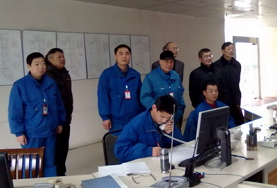 ????????2月7日正月初五,集團董事長楊振華和集團領導班子成員一大早就來到了張家港公司,看望節日期間堅持生產的干部職工,并送上新春的祝福。圖為楊總等領導正在生產調度室了解生產運行情況。