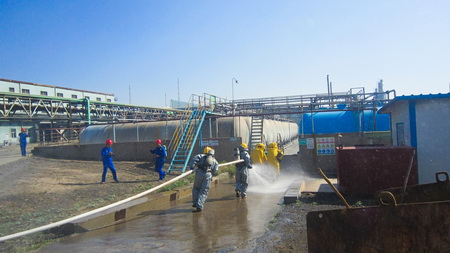 ? ? ? ? 為確保此次演練取得實效,演練開展前,消防隊隊長帶領消防隊員和儲運管理部義務消防隊員對酸罐區各類消防設施情況及重點部位進行了查看,并結合實際情況,對滅火作戰預案進行完善更新,確保數據準確詳實。10:30演練正式開始,災情假設儲運管理部酸罐區7#硝酸罐閥門破裂,大量硝酸泄露,一名巡檢人員在巡檢過程中暈倒,另一人立即報警并組織自救。接到報警后,消防隊迅速攜帶裝備趕赴現場,到達現場后,指揮員立即組織開展偵查,并下達作戰命令,迅速疏散周邊員工,搜救組在掩護組水槍掩護下進行搜救被困人員,另一支戰斗小組利用水幕水帶在下風方向對酸霧進行不間斷稀釋。11:00演練結束后,消防隊長就此次應急救援實戰演練進行了點評,指出了在演練過程中存在的不足之處,并制定了相應的整改措施,確保順利完成各項滅火救援任務。安環部部長趙云祥對國慶節前的安全生產工作提出了要求。